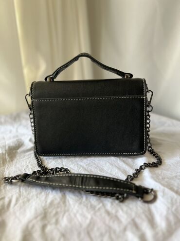 ZARA qadın çantası – qara rəngdə, zəncir detallı model. - Material: parlaq fakturalı ekodəridir. - Dizayn: flap qapaqlı, maqnit düyməli; yanlarda qalın metal zəncir və tənzimlənən çiyin kəməri. - ...