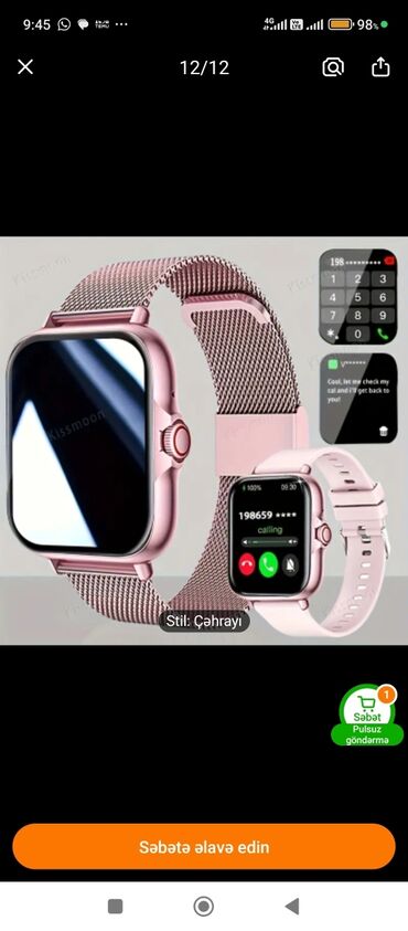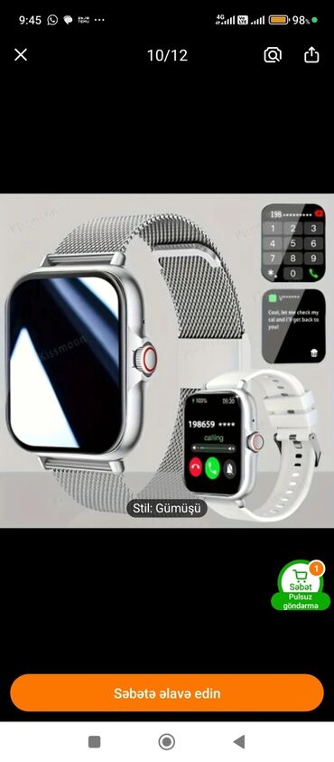 Ağıllı saat – zəng və mesaj funksiyalı, toxunma ekranlı, kvadrat korpus.