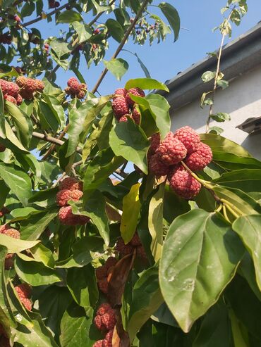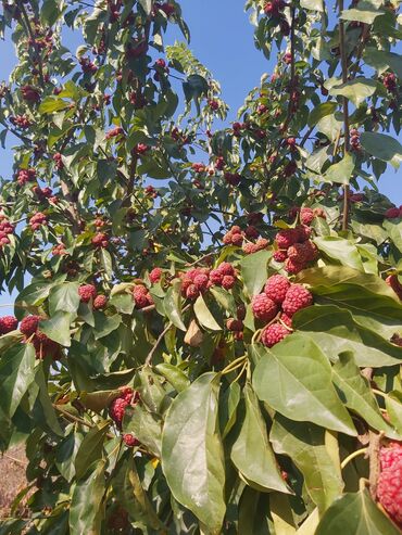 Клубнично-шелковичное дерево с плодами цвета клюквы. Это дерево украсит ваш сад как своим декоративным видом, так и вкусными плодами. Плоды ярко-клюквенного цвета и обильно плодоносят. Листья дерева зелёные и здоровые, что свидетельствует о его хорошем развитии. Плоды идеально подходят для употребления в свежем виде, приготовления варенья, сока и других блюд. Zoğal rəngli meyvələri olan çiyələk-tut ağacı. Bu ağac həm dekorativ görünüşü, həm də dadlı meyvələri ilə bağçanıza gözəllik qatar. Meyvələr parlaq zoğal rəngindədir və bol məhsul verir. Ağacın yarpaqları yaşıl və sağlamdır, bu da onun yaxşı inkişaf etdiyini göstərir. Meyvələri təzə halda istehlak etmək, mürəbbə, şirə və ya digər məhsullar hazırlamaq üçün idealdır.