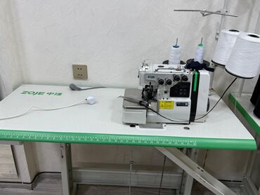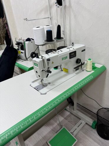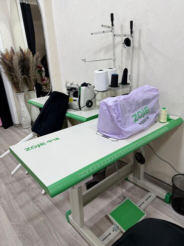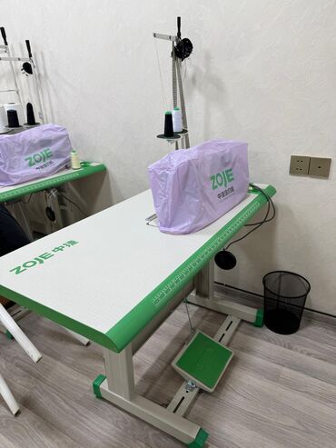 - Şəkillərdə görünənlər: ZOJE düz tikiş maşını və masası, ZOJE örtükləri, iplik konusları, overlok HIKARI, ayaq pedalları və iş masaları.