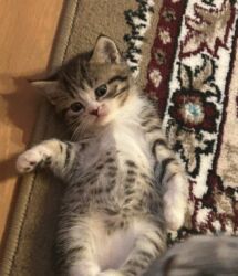 Şəkildəki pişik balası zərif zolaqlı naxışı və ağ corablı pəncələri ilə çox cazibədardır; yeni evinə sevinc qatmağa hazırdır.
