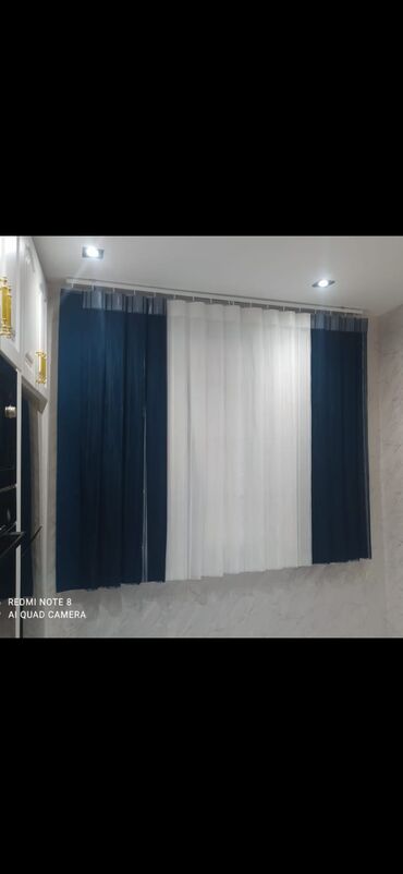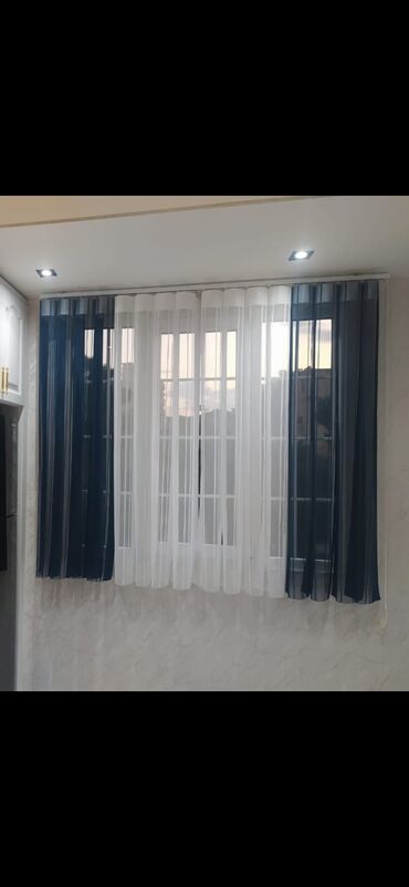 - Rəng kombinləri: Ortada ağ şəffaf tül, kənarlarda dərin göy (bir nümunədə qrafit/boz) panellər