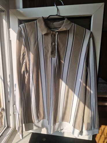 Çox az geyinilib lakin çox yaxşı vəziyyətdə, Yaxa hissəsində üç düyməli, qısaqol kişilər üçün polo köynəyi. Köynək boz, mavi və ağ rənglərdə zolaqlı naxışa malikdir. Bu polo köynək gündəlik istifad...