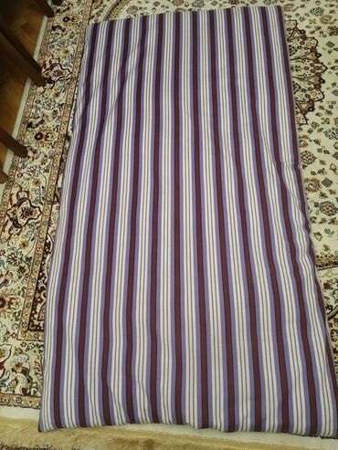 Qonaq döşəyi / yataq döşəyi - Ölçü: təxminən iki nəfərlik (şaquli yerləşdirildikdə eni geniş, yerdə sərilən tip). - Material: qalın, yumşaq içlikli döşək; üzlük parça zolaqlı və naxışlı (tünd qırm...