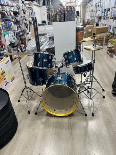 Mavi rəngdə TAMA zərb aləti dəsti, müxtəlif ölçülü davullar və zərb lövhələri ilə təchiz olunub. Bu dəstə bir bass davul, iki asma davul, bir döşəmə davulu və bir neçə zərb lövhəsi daxildir. Zərb a...