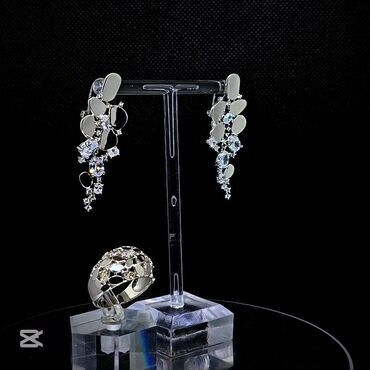 Zərgərlik dəsti – sırğalar və üzük - Material: ağ metal əsas (gümüş tonlu), parlaq cilalanmış səth. - Dizayn: üzvi formalı oval və damcı elementlərin mozaikası; şəffaf, parlaq kəsimli daşlarla (ku...