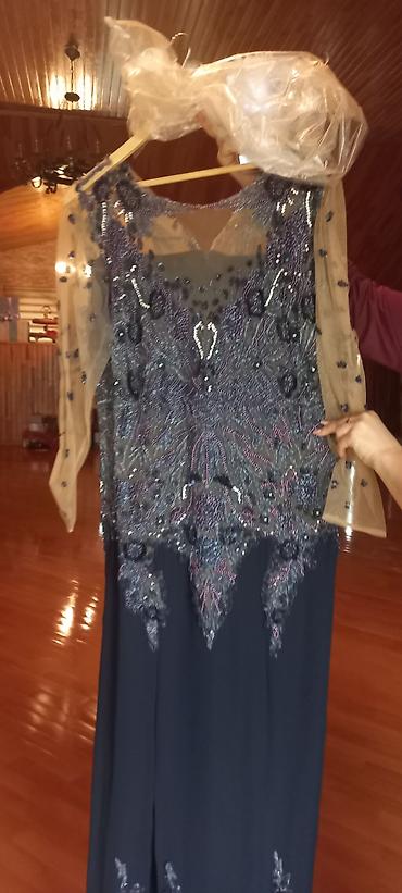 Zərif gecə/libas – tünd royal mavi rəngdə, tam bədən boyu. - Parça: nazik şifon və atlas qarışığı əsas, üzəri sıx şəkildə qızılı rəngli muncuq və payet naxışlarla bəzədilib. - Dizayn: V-oyunlu döş...