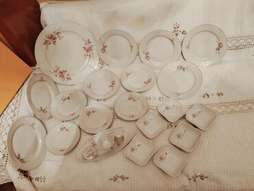 - Komplektdə müxtəlif ölçülü boşqablar, oval servis qabları, sous qabları və kiçik kvadrat nimçələr var