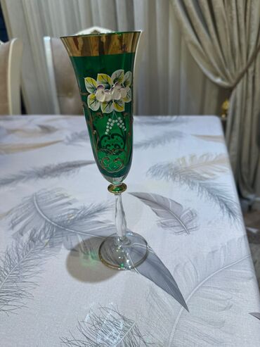 - 1 ədəd hündür, nazik qədəh – şəffaf ayaqlı, zümrüd-yaşıl kasa hissəsi və qızılı kənarla