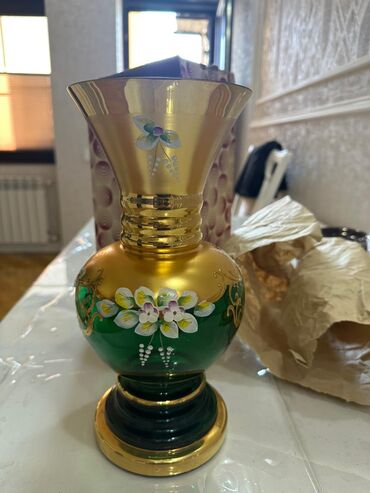 Bəzəkli şüşə vaza - Material: qalın yaşıl şüşə, parlaq qızılı rəngli örtüklə kombinasiya - Dizayn: əl işinə bənzər zərif floral naxışlar və qızılı ornamentlər; romb şəbəkəli fon; ağ-çəhrayı çiçək ...