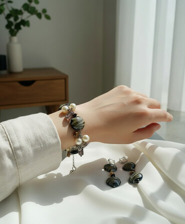 - Elementlər: iri, yuvarlaq, şüşə qabarcıq effektli muncuqlar (yaşıl-boz, dalğavari naxışlı), krem rəngli inci bəzəklər, bənövşəyi şəffaf faset daşcıqlar, kiçik kəhrəba tonlu və açıq yaşıl kvadrat muncuqlar.