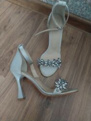 Zərif qadın ayaqqabısı – açıq burunlu, yüksəkdaban (təxminən 9–10 sm) sandal model. Rəngi açıq krem/ivory tonlarında. Barmaq hissəsində iri şəffaf daşlardan bəzək kompozisiyası (çiçəkvari) var, işıqda parıltı verir.