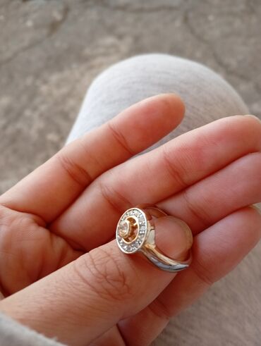 Gümüş rəngli zərif qadın üzüyü - Dizayn: dairəvi “halo” başlıq; mərkəzdə parlaq şəffaf daş, ətrafında xırda parıltılı daşların halqası. - İki rəngli detal: mərkəz hissədə qızılı tonlu halqa elemen...