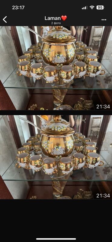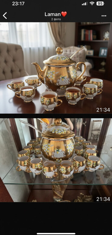 - Fincanlar: eyni üslubda qızılı-ağ rəng çaları, rellef çiçək bəzəkləri və qızılı qulplar. Komplektdə çoxsaylı fincan var (fotodakı kimi tam dəst).