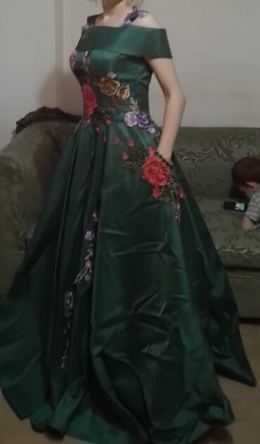 Zümrüd-yaşıl rəngdə, balo siluetli uzun ziyafət geyimi. Geniş ətəkli, beldən oturan kəsim. Üst hissədə enli “off-shoulder” yaxa xətti, çiyinlərə doğru açıq dizayn. Bütünlükdə böyük, rəngbərəng 3D güllü aplikasiyalar (çəhrayı, bənövşəyi, bej və qırmızı tonlarda) ilə zəngin naxış işləmələri. Parça atlas effekti ilə parlaq görünüş verir. Yanlarda rahat cib detalları mövcuddur. Arxa hissə və ətək boyunca gül bəzəkləri davam edir, mərasim və xüsusi günlər üçün ideal, diqqətçəkən elegant stil.