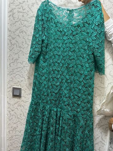 Zümrüd yaşıl rəngdə, tam krujeva (ağzı gül naxışlı) qadın paltarı.