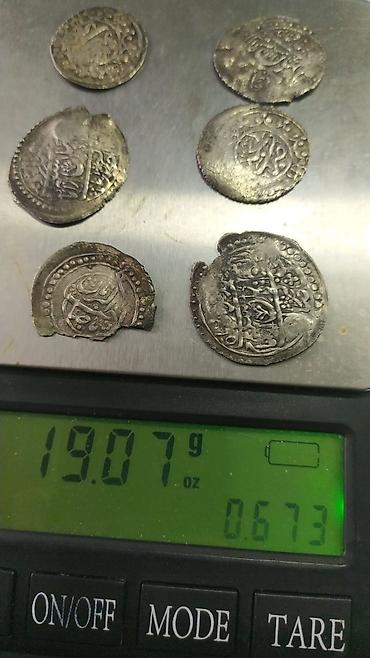 - Gümüş sikkələr toplusu: 6 ədəd orta əsr şərq yazılı naqişli sikkə (bəzi nümunələrdə kənar qopmaları var). Ümumi çəki şəkildəki tərəzidə 19.07 qram göstərilir. Səthində kufi/nəsx üslubunda yazılar və ornamental haşiyələr seçilir.