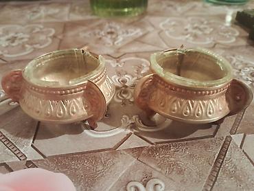- 2 ədəd bəzəkli mini mis/kupro-nikel qab: üçayaqlı, hər iki tərəfdən qulpçuqlu, damcı naxışlı haşiyə. Daxili hissədə qədim şüşə/şirə qalıqları görünür. Dekorativ istifadə, kolleksiya və etno-interyer üçün uyğundur.