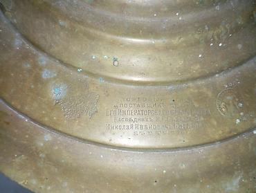 - Üstündə çar Rusiyası dövrünə aid dövlət gerbi, medal və sərgi nişanları həkk olunub (sənaye sərgiləri üzrə mükafat işarələri görünür)
