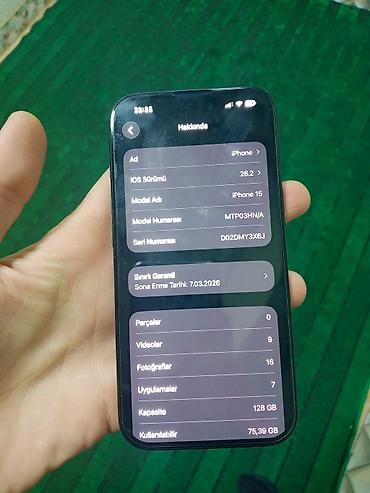 Apple iPhone 15 Pro – 128 GB, Titan korpus, iOS 26.2 Xüsusiyyətlər: - Model: iPhone 15 Pro (Model nömrəsi: MTV03HX/A) - Yaddaş: 128 GB - Rəng: Tünd titan (şəkillərdə) - iOS versiyası: 26.2 - Ekra...