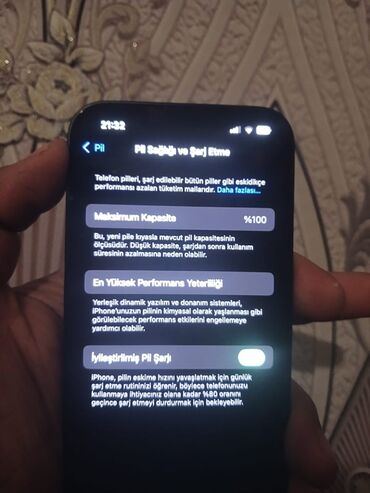 - Batareya: “Pil Sağlığı” bölməsində maksimum tutum 100% göstərilir; “İyileştirilmiş Pil Şarjı” aktivdir