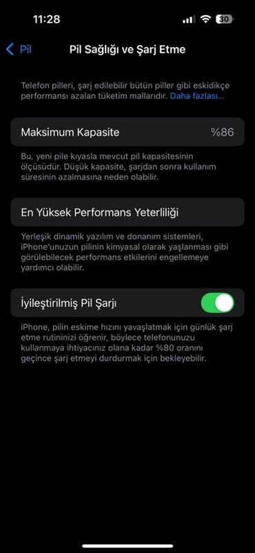- Batareya məlumatı: Maksimum tutum 86% (ekran görüntüsündə göstərildiyi kimi), Ən yüksək performans səviyyəsi aktiv, İslah edilmiş (Optimized) şarj açıqdır