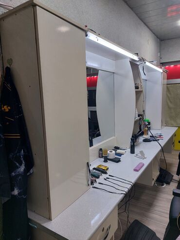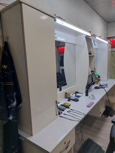 Bərbər lavabosu və güzgülü iş stendi - Material: tünd rəngli laminat/taxta karkas, metal/plastik lavabo hissəsi - İnteqrə olunmuş geniş güzgü - 1 ədəd qara rəngli dərin lavabo, qarışdırıcı kranla ...