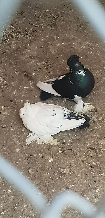 Növ: Ev göyərçinləri (bəzək və uçuş üçün) Rəng və naxış: Ağ əsaslı, qara-qəhvəyi xallı/çilləli lələklər; boyunda tünd bənövşəyi-yaşıl parlaqlıq Lələk quruluşu: Ayaqlarda saçaqlı lələklər (pantolonl...