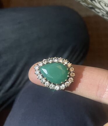 Zərgərlik üzüyü – yaşıl damarlı mərkəzi daş və parlaq çərçivə - Üzük baş hissəsi: armud/çəhrayı damla formalı iri yaşıl daş (fasetli). - Çərçivə: daşın ətrafı dairəvi şəkildə düzülmüş şəffaf parla...
