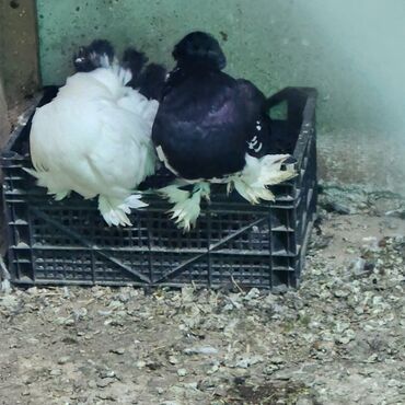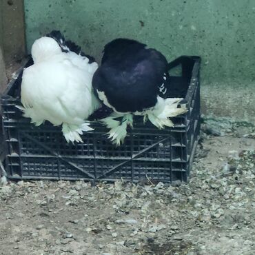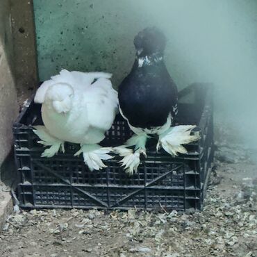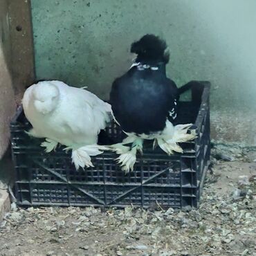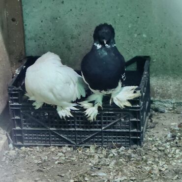 Cütlük göyərçin - Növ: ev göyərçini (papaqburun/zərif başlı tip, dekorativ və uçuş üçün uyğundur) - Rənglər: biri tam ağ, digəri tünd (qara-boz tonlarında) kontrast quyruq ucları ilə - Cins: cüt k...