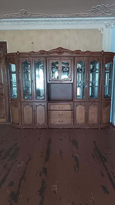 - Qonaq otağı üçün iri vitrinqa/divar dolabı: küncləri qövsvari, şüşəli vitrin bölmələri, mərkəzdə açıq rəf və 3 çekmece, dekorativ oyma elementlər və naxışlı fasadlar. Qab-qacaq və dekor üçün işıqlı şüşə qapılar, aşağıda bağlı dolab bölmələri.