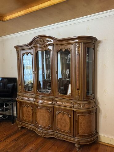 - Ön hissə: üç qanad şüşəli vitrin bölməsi, içəridə güzgülü arxa panel və şüşə rəflər – qab-qacaq, biblio və kolleksiya üçün ideal nümayiş sahəsi