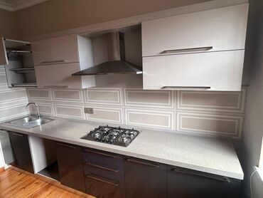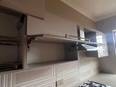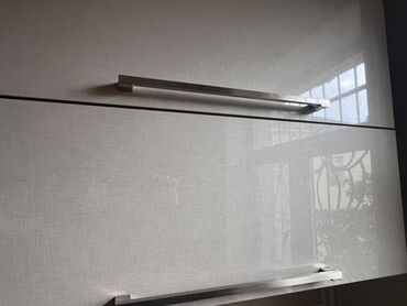 - Üst dolablar: parlaq açıq rəngli fasadlar, uzun xrom tutacaqlar, yuxarı açılan sistem (Blum mexanizmi).