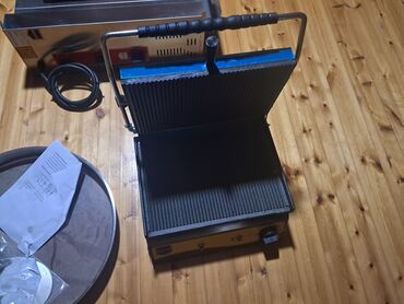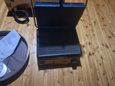 - Elektrikli kontakt ızgara/sandviç presi – çertyojlu (ri̇li̇efli) üst-alt döküm plitələr, temperatur tənzimləyici düymə, açma/söndürmə düyməsi, istilik göstəricisi. Üst qapaq “HOT SURFACE” xəbərdarlığı olan metal lövhə ilə, iki tutacaqlı sıxma mexanizmi.