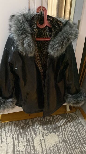 Qara parkə üslublu qadın üst geyimi, ağ süni tükdən (xəz effektli) iri yaxalıqla. - Ölçü: XL (şəkildə qeyd olunub) - Ön hissədə gizli fermuarlı əsas bağlanma və üstündən düyməli qapaq - Döş hiss...