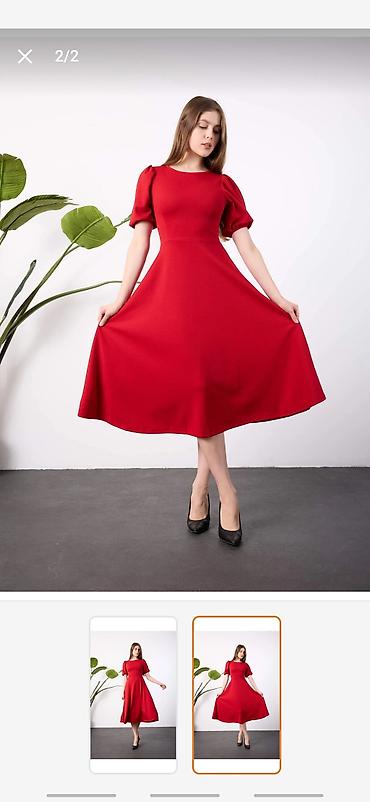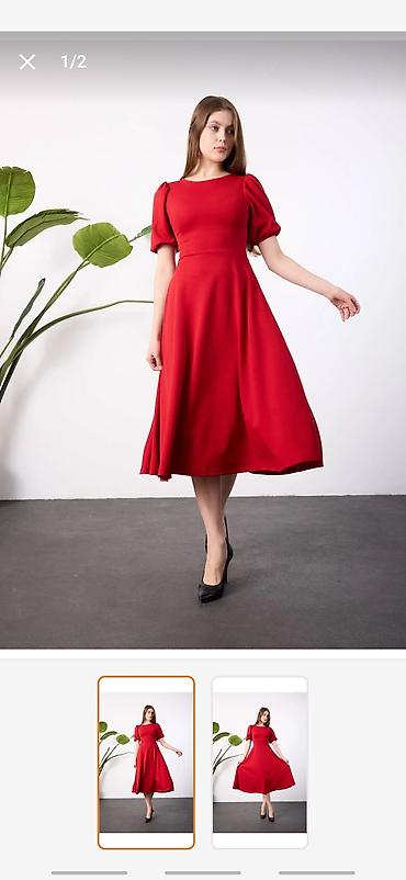 Qırmızı rəngli qadın donu - Ölçü: M (etiketdə göstərilib) - Uzunluq: 102 sm (şəkildə qeyd olunub) - Model: V formalı ön və arxa dekolte, bel hissəsində büzgü və düyün effekti, asimmetrik təkqol kəs...