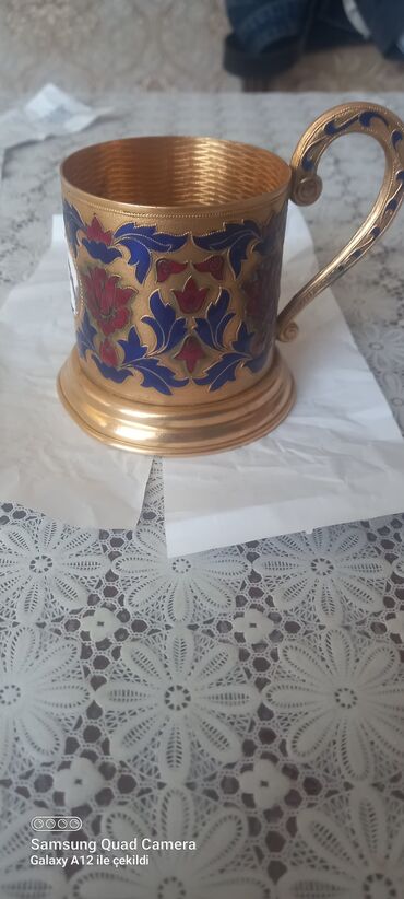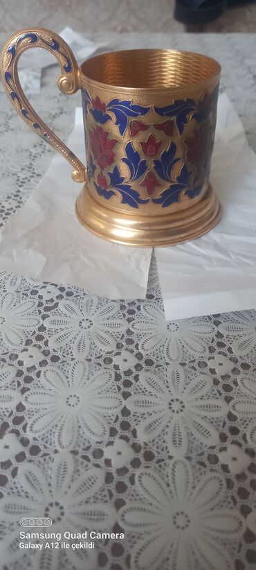 Digər həcmQızılı rəngdə, üzərində güllər və bəzək elementləri olan çay stəkanı altlığı. Stəkanın üzərindəki kiçik rəsmdə qış mənzərəsi təsvir olunub. Metal materialdan hazırlanıb və çay içmək üçün rahat istifadəyə yararlıdır.