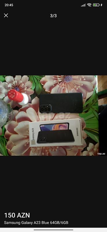 Samsung Galaxy A23 4G, qara rəng. - Ekran: 6.6" Infinity‑V, Full HD+ LCD, nazik çərçivə, rahat oxunuş və video izləmə. - Yaddaş: 6 GB RAM, 128 GB Telefonun hec bir prablemi yoxdur tam işlekdir ci...