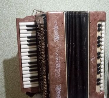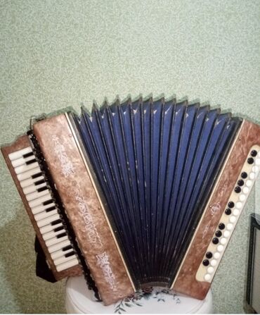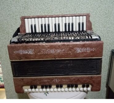 Akkordeon – klavişli və bas düyməli - Tip: Klavişli akkordeon (piano klaviaturası) və sağ tərəfdə bas/akord düymələri - Korpus: Qəhvəyi-mərmər fakturalı örtük, metal yan qapaqlar, klassik keçə kör...