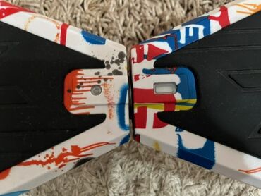 Ağ rəngli, müxtəlif rəngli qrafiti naxışları ilə bəzədilmiş hooverboard. Bu modeldə ayaqlar üçün qara, tutuş təmin edən rezin örtüklər var. Təkərlər hər iki tərəfdə qara qoruyucu qapaqlarla örtülmü...