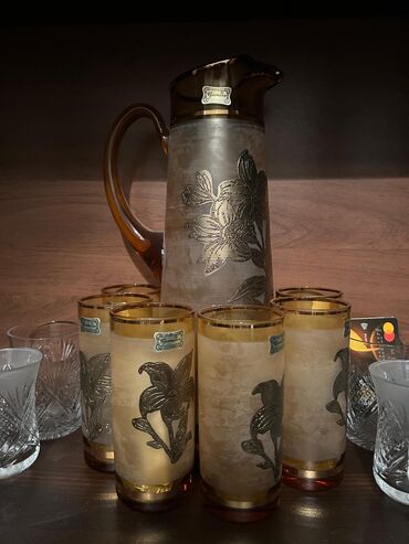 Qədimi üslubda bəzəkli şüşə dəstlər və vazalar 1) Qrafin və stəkan dəsti – 7 parça - 1 ədəd hündür qrafin (qızılı tonlarda, mat zolaqlı, relyef floral naxışlı) - 6 ədəd hündür stəkan - Hamısı eyni...