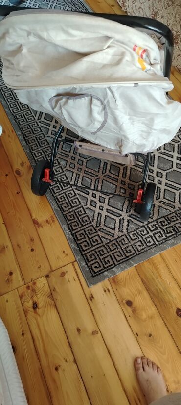 Uşaq arabası – bej rəngdə, təkərləri iri plastik, karkası qara metal.