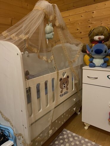 - Beşik: ağ rəngdə, “teddy” temalı dekor, yanları sürahili taxta barmaqlıqlar, alt hissədə saxlama üçün çekmecələr. Üst hissədə qızılı haşiyəli cibin/sineklik (tül baldaxan) quraşdırılıb.