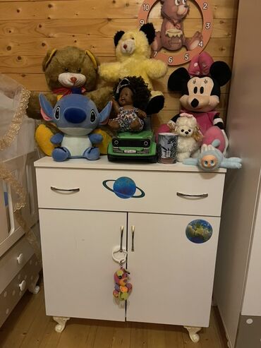 - Komod: iki qapılı şkaf və üst hissədə iki çekmecə, ağ rəngdə, planet temalı stikerlərlə bəzədilib. Qablaşdırma və gündəlik aksesuarlar üçün rahat saxlanclı.