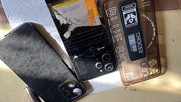- Ekranda və arxa şüşədə çoxsaylı çatlar mövcuddur; arxa örtüyün aşağı hissəsi qopub, batareya və daxili hissələr görünür.