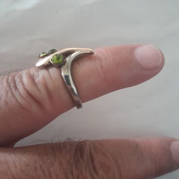 Yaşıl daşlı zərif qadın üzüyü - Material: gümüş tonlu metal (üzərində xırda dekorativ naxış və mikro-bərqərar daşcıqlar) - Mərkəzi daş: yumru/kabajon kəsimli yaşıl daş - Dizayn: dalğavari, mərkəzi...