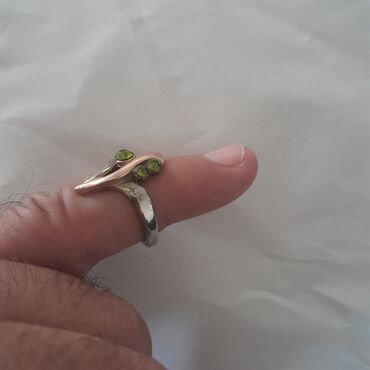 Digər qaşYaşıl daşlarla bəzədilmiş, iki tonlu metaldan hazırlanmış zərif üzük. Üzüyün dizaynı dalğalı formaya malikdir və üç ədəd yaşıl rəngli daşla tamamlanmışdır. Bu üzük, gündəlik istifadə üçün və ya xüsusi tədbirlər üçün uyğun bir aksesuar ola bilər. Məhsulun çəkisi 4.91 qramdır.