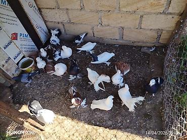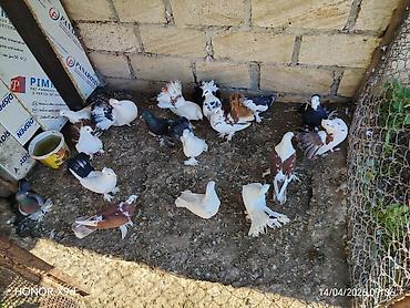 Ev göyərçinləri – müxtəlif rəng və naxışlarda - Növ: dekorativ/ev göyərçinləri - Rənglər: ağ, ağ-qəhvəyi, ağ-qara qarışıq (xallı) - Xarakterik xüsusiyyətlər: dik duruşlu, uzun quyruqlu, baş nahiyə...