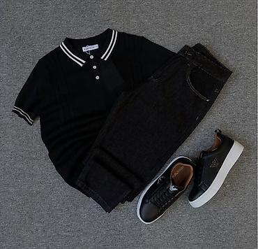 - Polo köynək: Qara rəng, qısa qollu, trikotaj fakturalı ön səth, 3 düyməli qapaq, ikizolaqlı ağ xəttli yaxa və manjet detalları. Etiketdə “MODERN STYLISH” yazısı görünür.