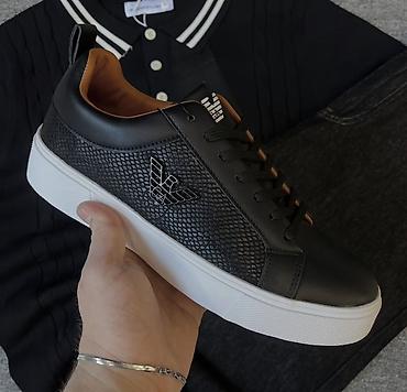 - İdman ayaqqabısı: Qara üst hissə, yanlarda teksturalı (mesh/naxışlı) panel, bağlama ilə; kontrast ağ qalın altlıq. Daxili astar qəhvəyi tonda, arxa hissədə asma halqası var. Yan tərəfdə loqo işləməsi mövcuddur.